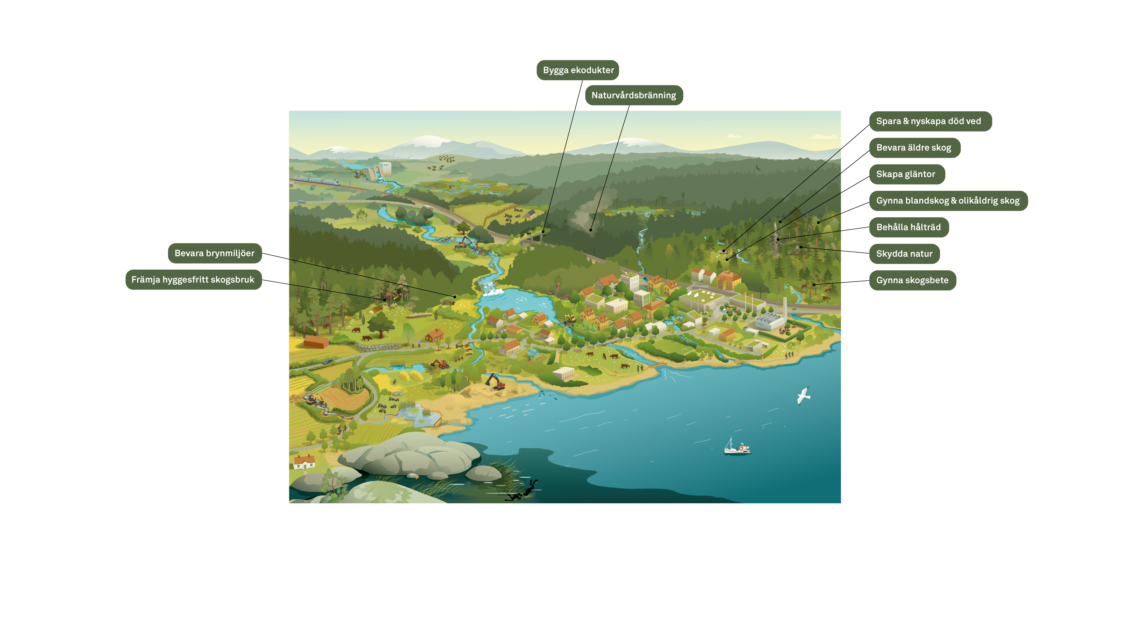 I det ursprungliga skogslandskapet finns det en stor variation av arter. Naturskogar är ofta olikåldriga och består av träd av olika höjd, grovlek och ålder. Ett alltför intensivt och ensidigt brukande av skogslandskapet har lett till brist på gamla skogar, gamla träd, död ved samt vissa trädslag och skogstyper. Många skogslevande arter är idag rödlistade och/eller har ogynnsam status eller negativ utveckling i det nuvarande skogslandskap.