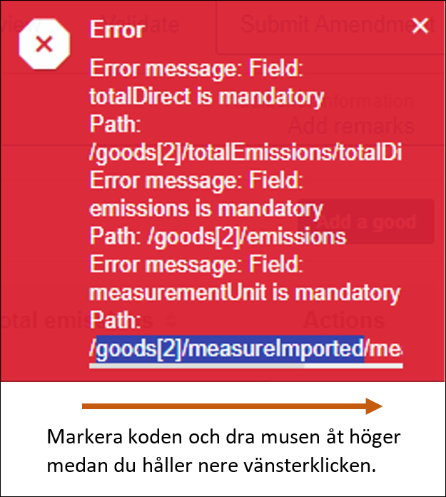 Nedan visas vanliga felmeddelanden som du kan stöta på i kvartalsrapporten och vägledning om hur de kan lösas. Felmeddelandena i övergångsregistret kan vara svårtolkade. Ett generellt tips är att läsa koden som följer efter ”Path” längst ned i felmeddelandet. Den anger var i rapporten felet finns. Om inte hela koden syns i meddelanderutan, markera koden med muspekaren och dra åt höger för att scrolla åt sidan.
