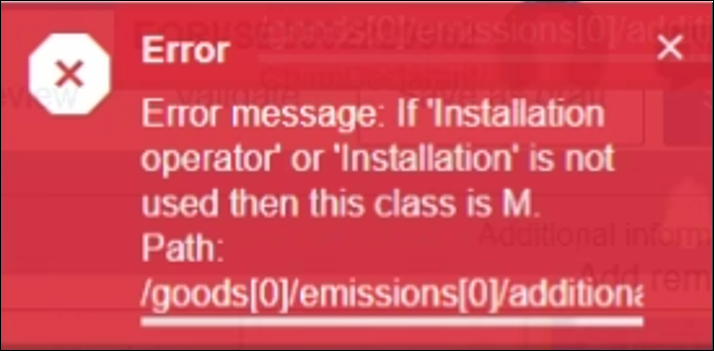 Felmeddelandet dyker upp om du inte fyller i fältet ”Supplementary”, som finns under utsläppsdata när du har valt ”Add emission”. För vägledning om hur fältet ska fyllas i, se rubriken ”Fliken ’Supplementary’ ” i lathundens avsnitt om utsläpp (”Emissions”). Felmeddelandet kan komma upp även om du inte har lagt till en anläggning en rapporten.