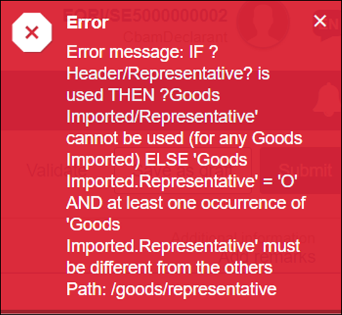 Felmeddelanden vid validering som rör ”importer” och ”indirect customs representative”.