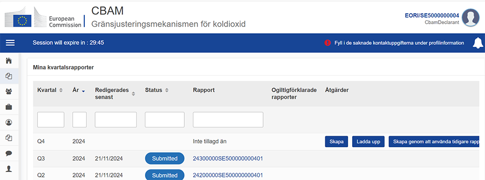 Om du är osäker på om din CBAM-rapport i övergångsregistret skickats in kan du klicka på Mina kvartalsrapporter i menyn till vänster. Då visas en lista över dina kvartalsrapporter.